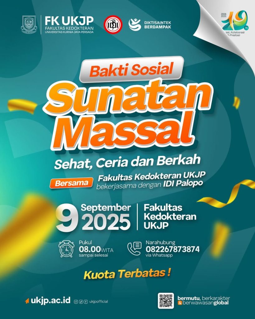 Bakti Sosial Sunatan Massal | Sehat, Ceria, dan Berkah admin ukjp 6 months ago Fakultas Kedokteran Universitas Kurnia Jaya Persada bekerja sama dengan IDI Palopo mengundang adik-adik untuk mengikuti kegiatan Sunatan Massal. Tanggal: 9 September 2025 Tempat: Fakultas Kedokteran UKJP Pukul: 08.00 WITA โ selesai Kuota terbatas! Jadi jangan sampai ketinggalan ya! Info & Pendaftaran:Whatsapp 0822 6787 3874Mari wujudkan kebersamaan melalui aksi sosial yang penuh manfaat