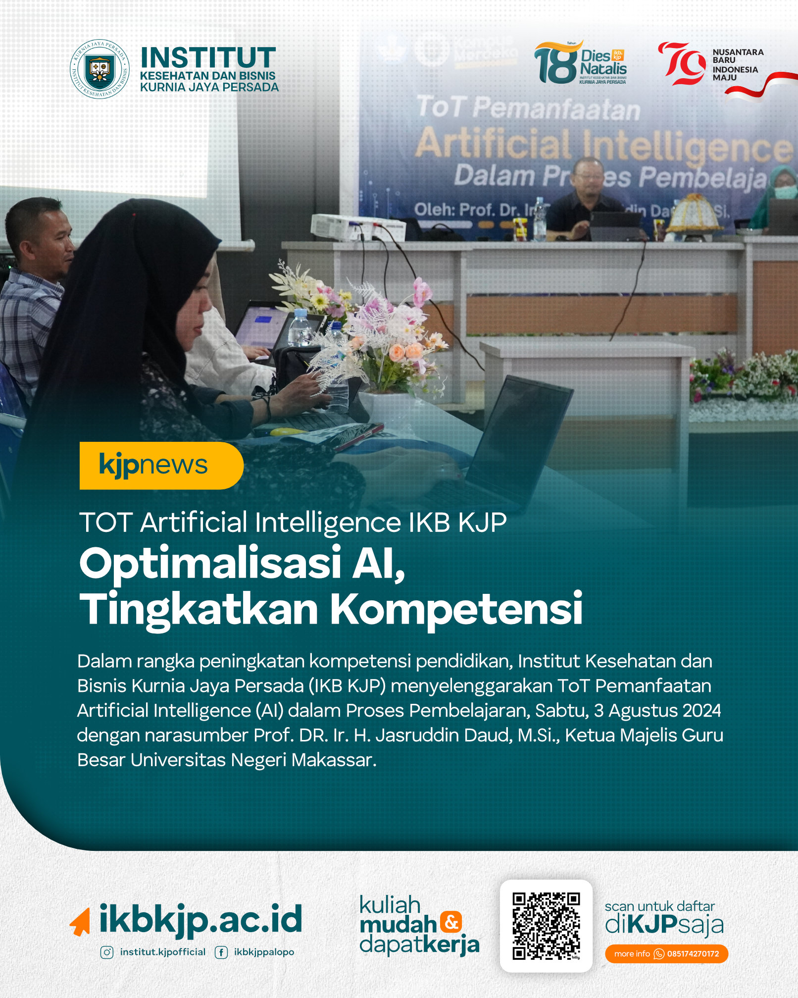 KJPNews – Dalam rangka peningkatan kompetensi pendidikan, Institut Kesehatan dan Bisnis Kurnia Jaya Persada (IKB KJP) menyelenggarakan ToT Pemanfaatan Artificial Intelligence (AI) dalam Proses Pembelajaran, Sabtu, 3 Agustus 2024....