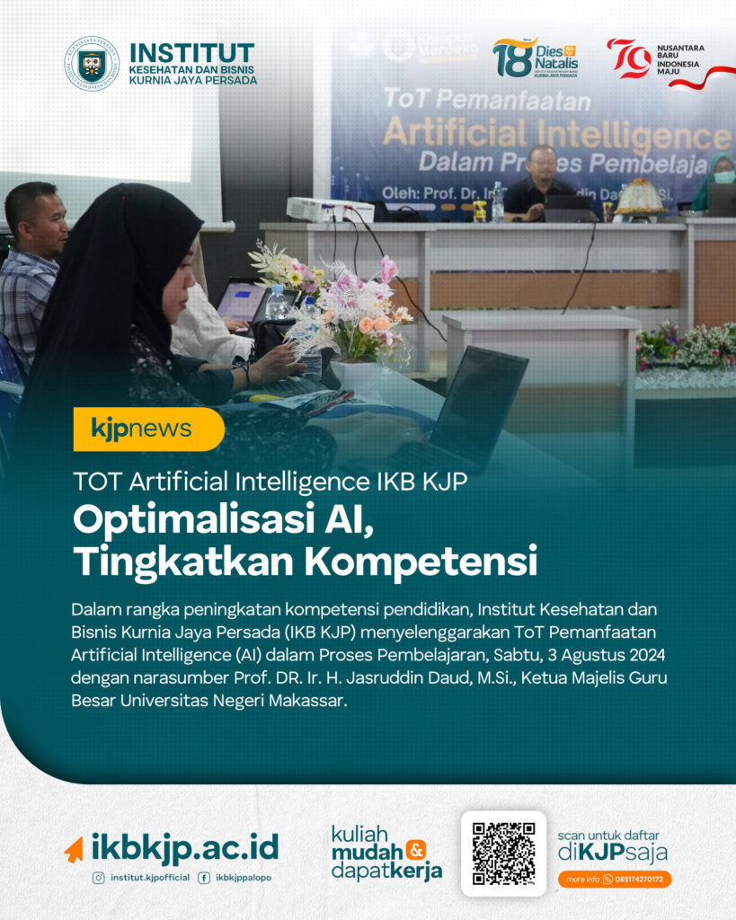 KJPNews – Dalam rangka peningkatan kompetensi pendidikan, Institut Kesehatan dan Bisnis Kurnia Jaya Persada (IKB KJP) menyelenggarakan ToT Pemanfaatan Artificial Intelligence (AI) dalam Proses Pembelajaran, Sabtu, 3 Agustus 2024.