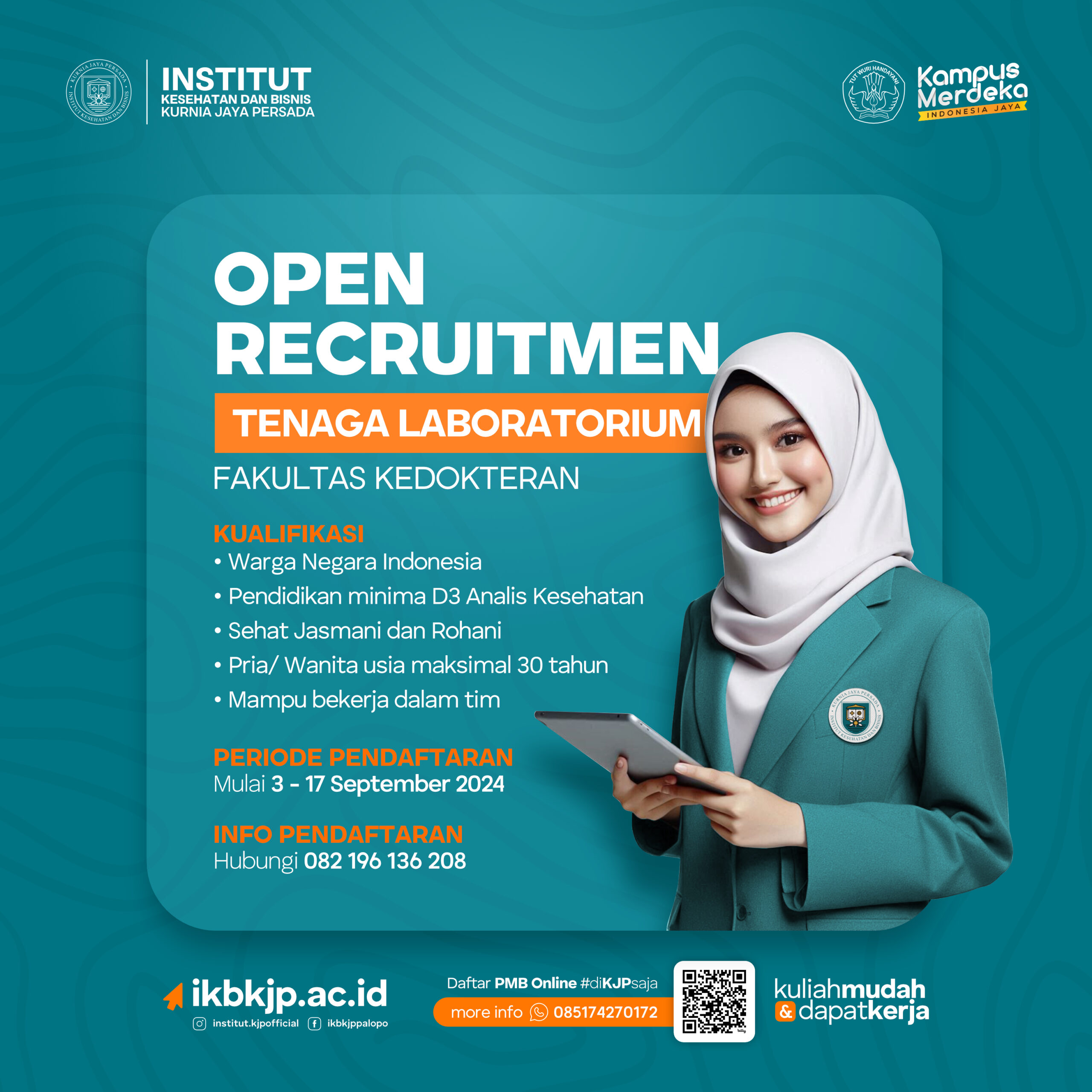 OPEN RECRUITMEN LABORAN FAKULTAS KEDOKTERAN INSTITUT KESEHATAN DAN BISNIS KURNIA JAYA PERSADA KUALIFIKASI • Warga Negara Indonesia • Pendidikan...